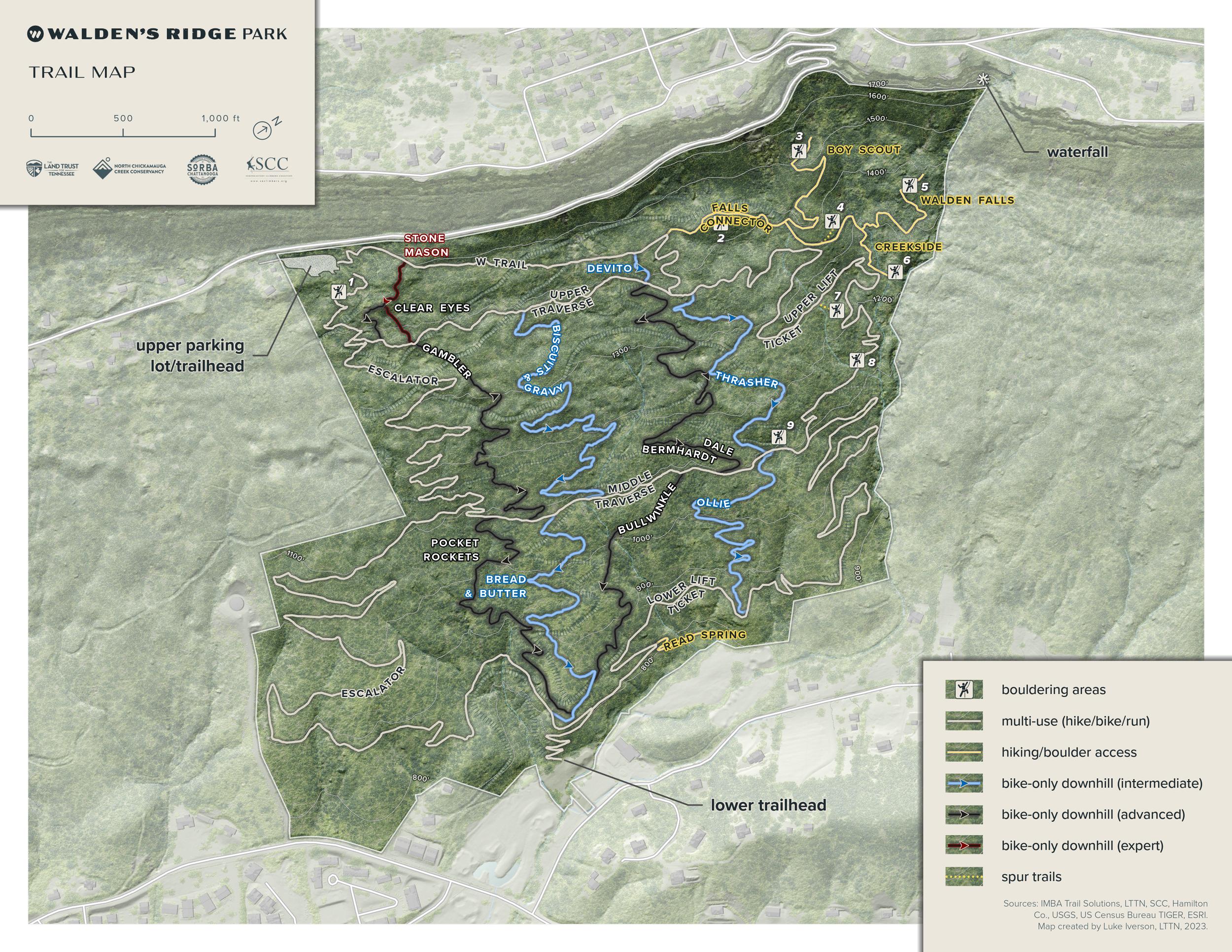 The plan for Walden’s Ridge Park is to develop a community park featuring an inclusive network of trails that serve the mountain biking, bouldering, trail running, and hiking communities. Here are some of the main plans for the park.